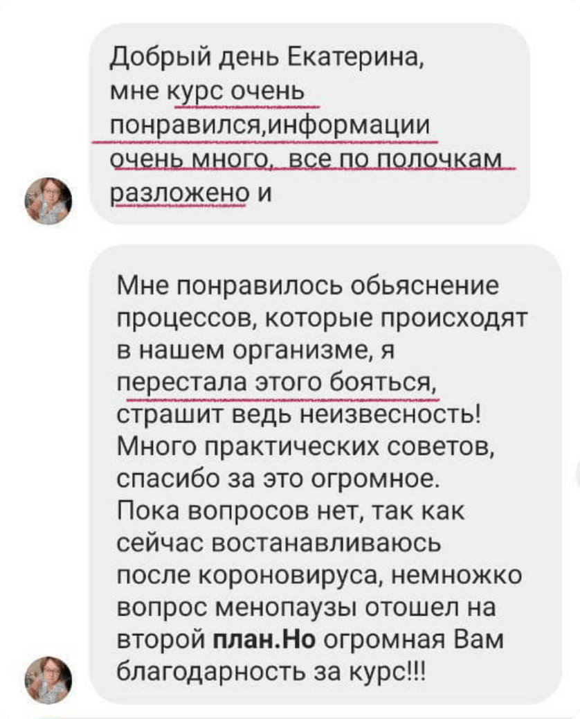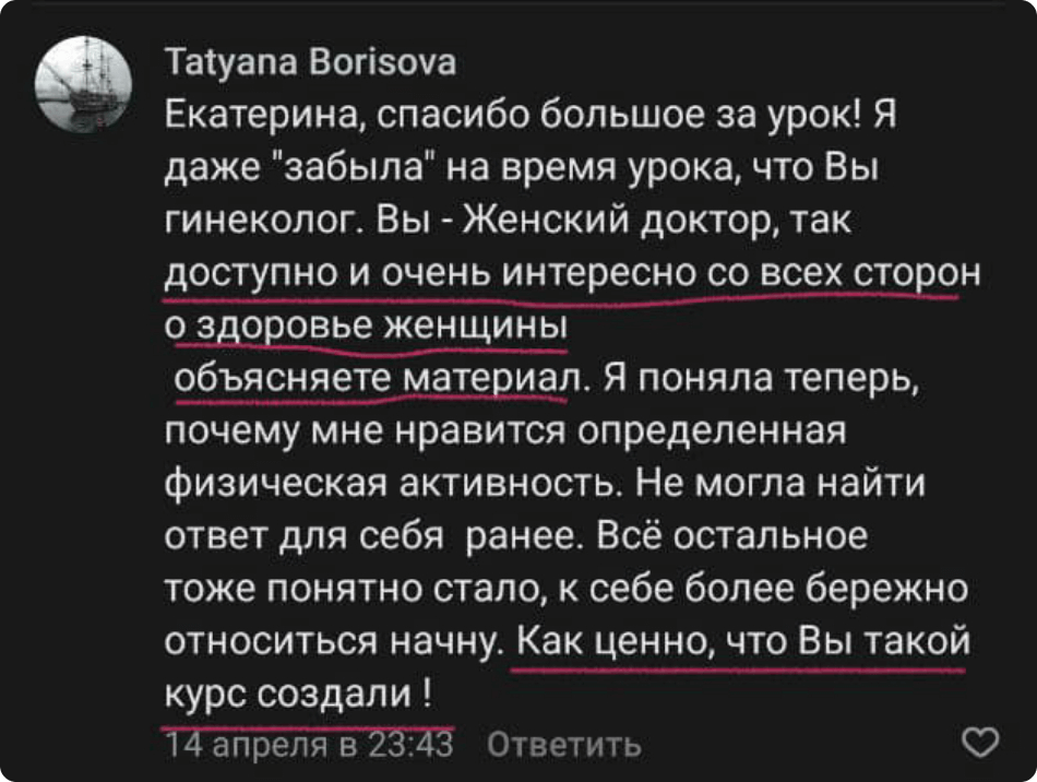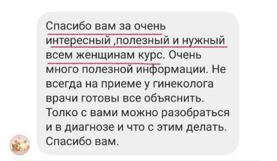 На курсе вы получаете в несколько раз больше знаний о гормональном здоровье, получаете трёхмесячный доступ в закрытый клуб, в котором есть поддержка врачей и регулярные полезные эфиры, а также личный чат с врачом на время обучения. Но главное отличие курса - индивидуальный разбор для каждой курсантки от врача, где разбираются анализы и даются письменные рекомендации (эпикриз)